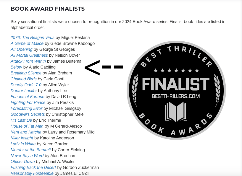 I’m elated to announce that Below is a BestThrillers Book Awards finalist! I’m honored to be recognized among such a great list of authors.